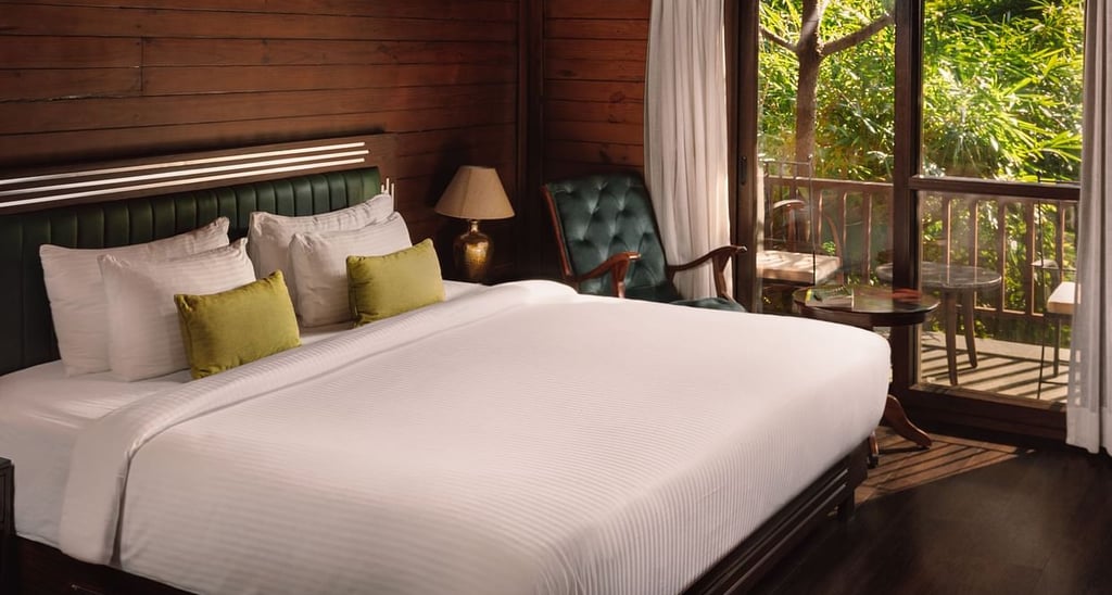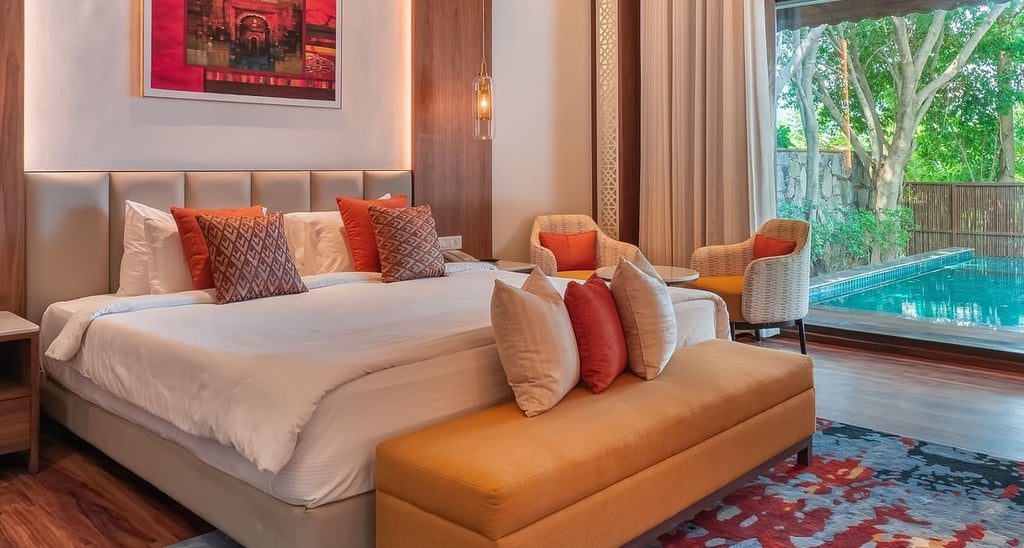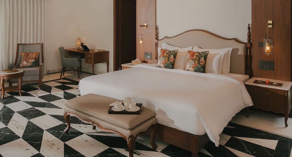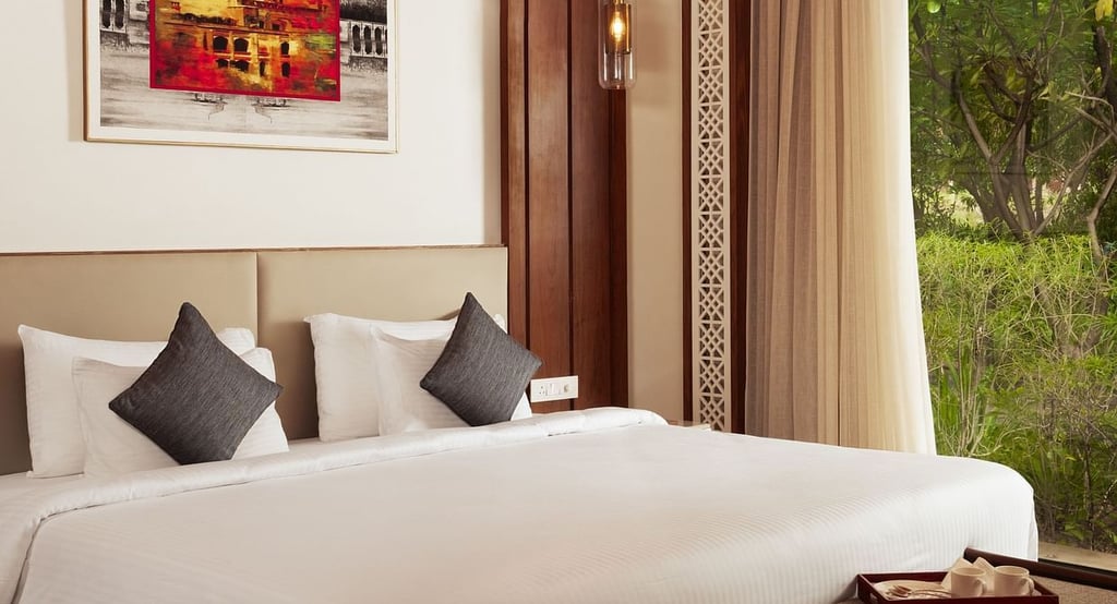 These suites in Udaipur measure 1080 sq. ft. and include a separate living room, dining space, and a private balcony.