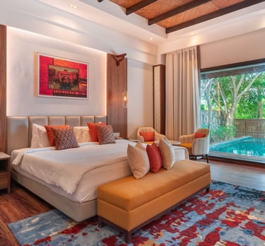 This villa is the most premium offering measuring 4500 sq. ft. at Ananta Udaipur. It features 3 bedrooms with 2 double beds and a twin bed, attached to separate large living and dining spaces. With a private swimming pool and balcony, you will have the ultimate time relaxing here!